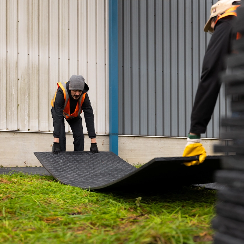 Upsyde-Fahrplatten aus recyceltem Kunststoff bieten effizienten Bodenschutz und Zugang, indem sie temporäre Wege für Fußgänger, Fahrzeuge oder Maschinen schaffen. Sie sind leichter als Stahl und ermöglichen eine schnelle, einfache und sichere Installation durch ein Zweierteam.